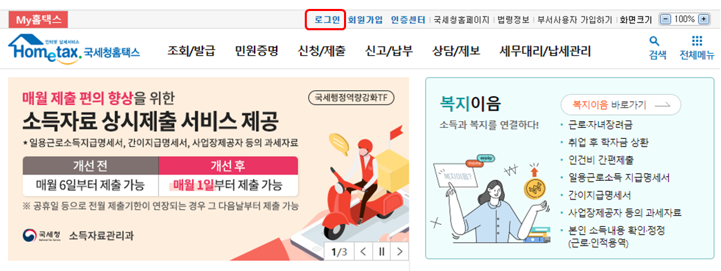 먼저 홈택스 사이트에 접속하여 로그인을 한다. (홈택스 바로가기)