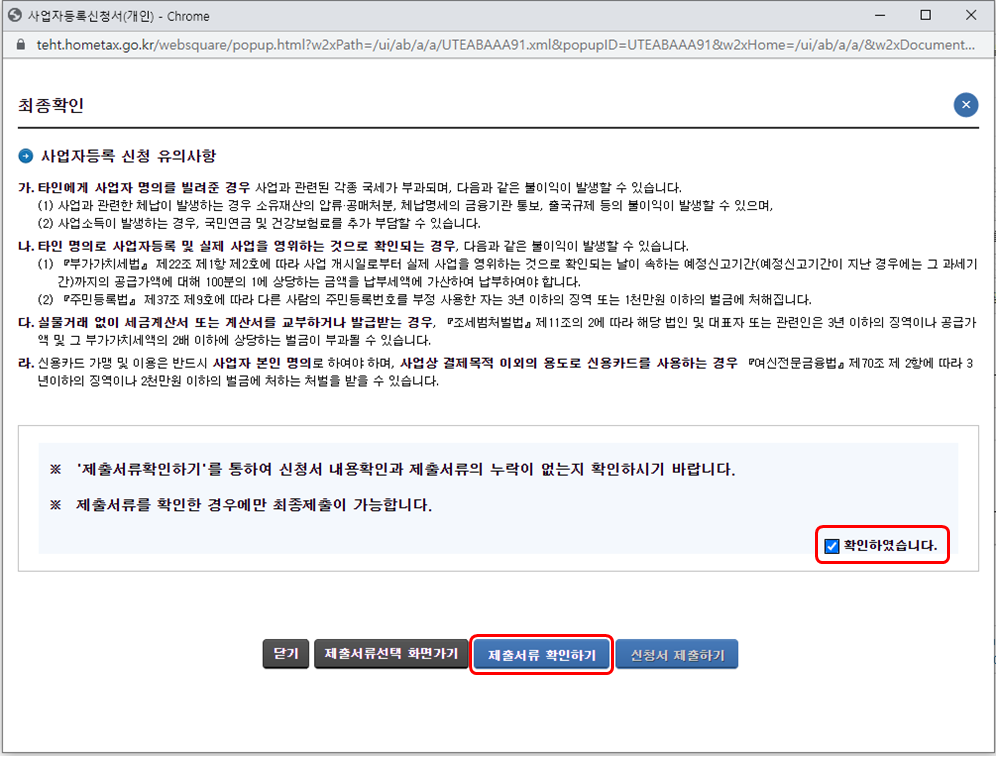 10. 최종확인창에서 확인하였습니다에 체크를 하고 제출서류 확인 버튼을 눌러 입력한 정보를 다시 한번 확인한다.