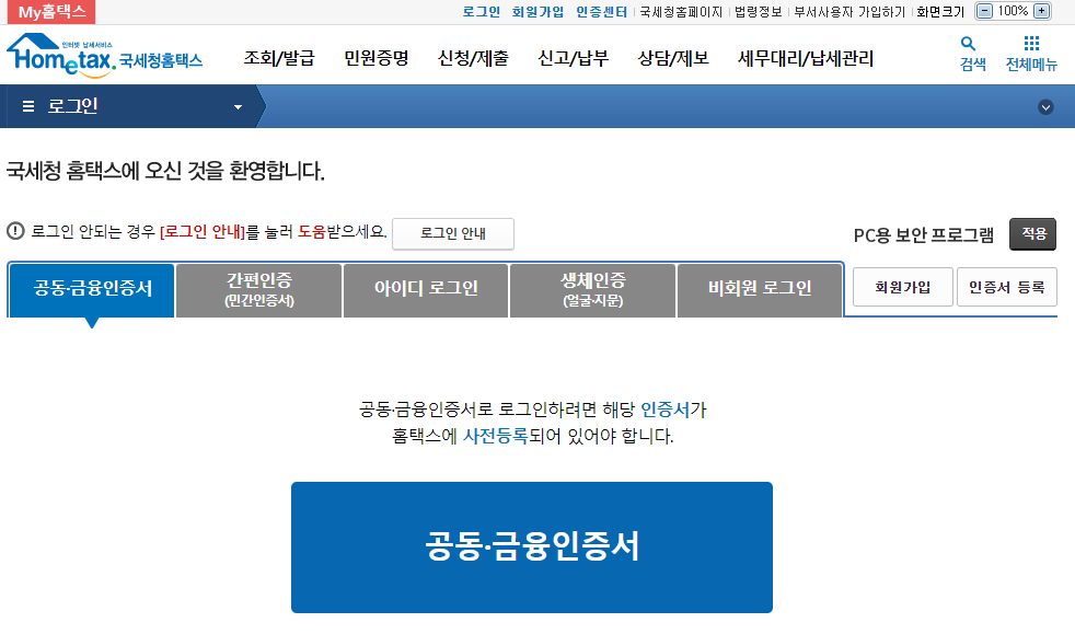 자신이 원하는 방식으로 로그인을 한다. 본인은 공동/금융인증서(인인증서)를 등록한 후 로그인했다.