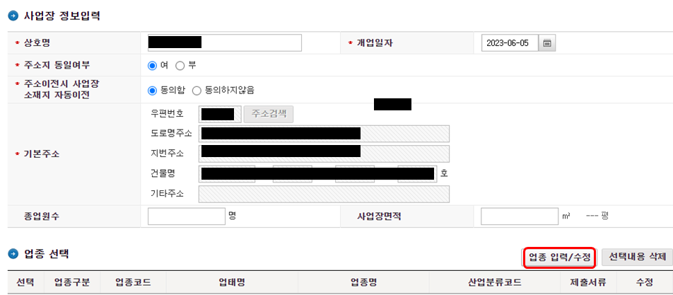 4. 상호명과 개업일자를 작성하고 사업자 주소지가 따로 없을 때는 본인이 거주하고 있는 자택으로 하면 된다.