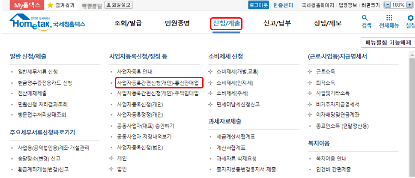 2. 상단의 신청/제출탭에 사업자등록간편신청(개인)-통신판매업 메뉴를 클릭한다.