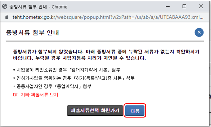 9. 주소지를 자택으로 설정한 경우 증빙서류가 따로 필요하지 않으므로 무시하고 다음을 눌러준다.