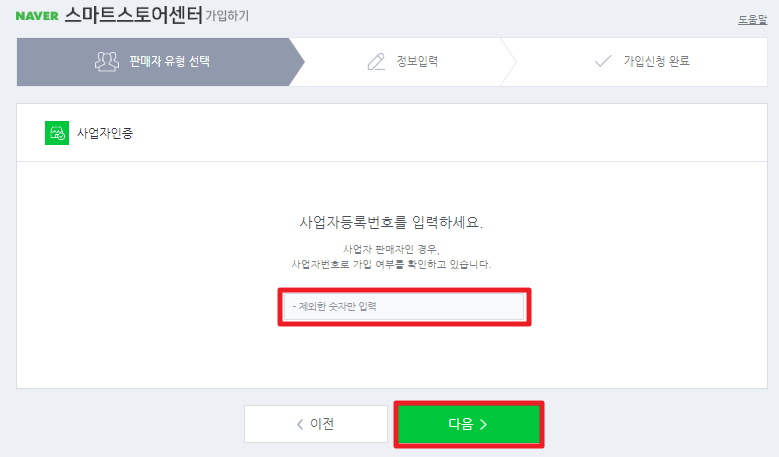 발급받은 사업자등록번호를 입력하고 다음 버튼을 누른다.