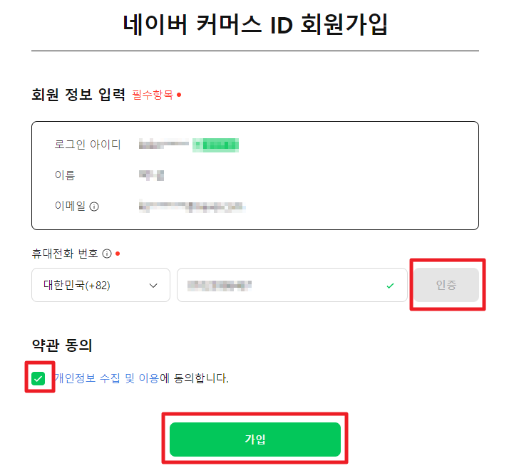 휴대전화 번호를 인증하고 약관 동의 후 가입을 누른다.