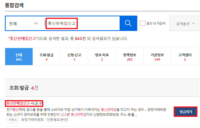 통합검색창에 '통신판매업신고'를 검색하여 아래 '발급하기' 버튼을 누른다.