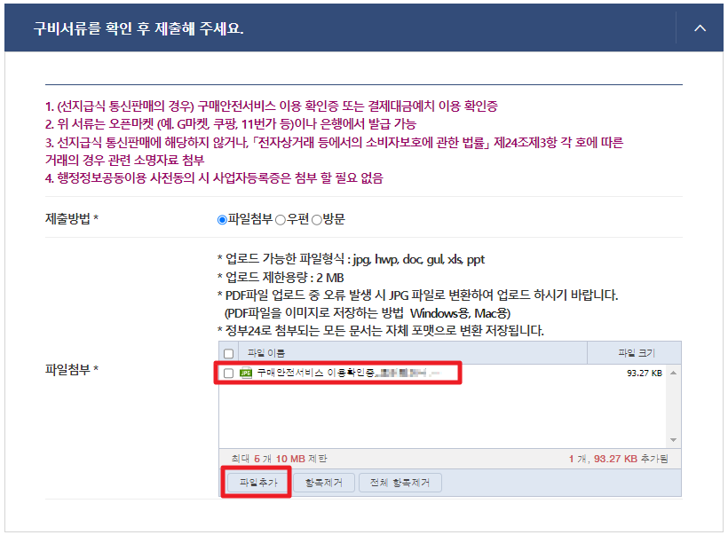 3. 구비서류 첨부(구매안전서비스 이용 확인증)