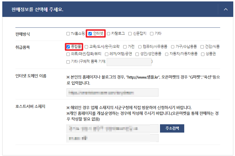 판매자정보란에서 판매방식은 인터넷, 취급품목은 종합몰에 체크해 주고 인터넷 도메인 이름에는 신규 개설한 스마트스토어 주소를 복사해서 붙여 넣기 하면 된다. 호스트서버 소재지는 스마트스토어의 소재지인 아래 주소로 입력하면 된다.