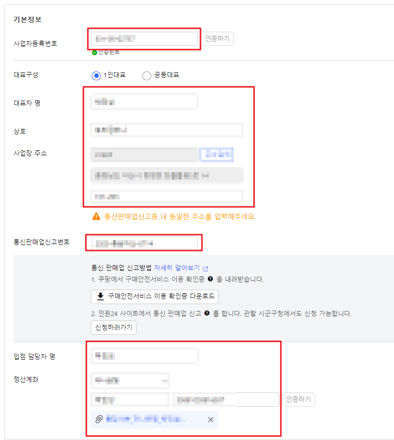 이전에 받아두었던 통신판매업 신고증에서 번호를 확인하여 작성하고 아래 정상받을 계좌 정보도 입력합니다.